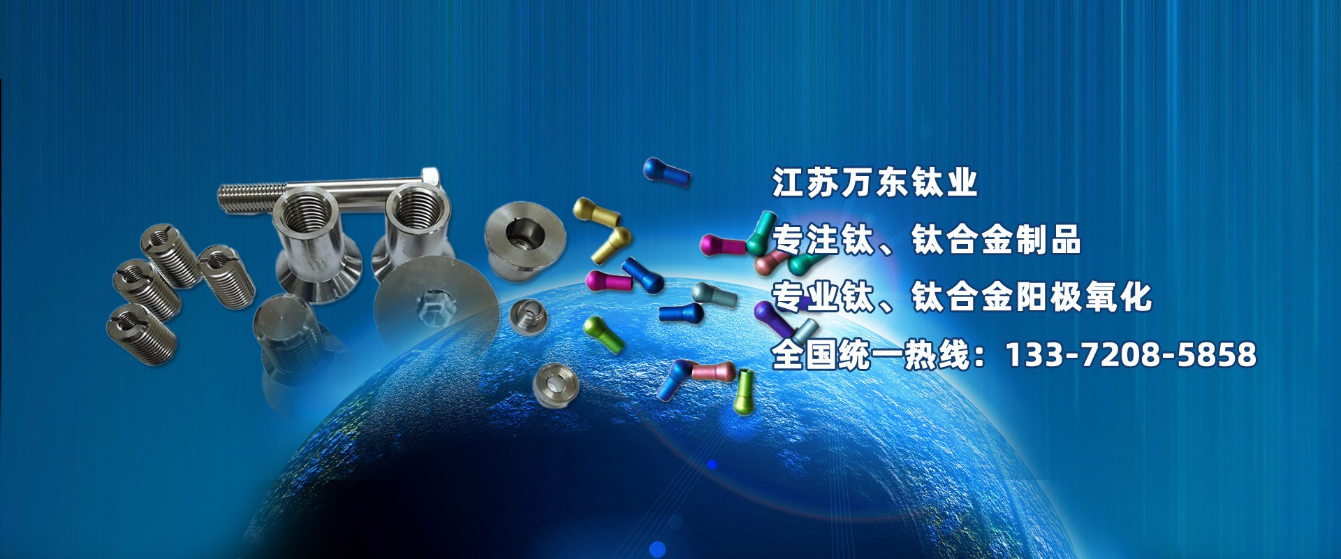 江蘇萬東鈦業(yè)科技有限公司坐落于中國江蘇省南通市,擁有28年的鈦合金研發(fā)技術,公司專業(yè)從事:鈦陽極氧化、鈦合金陽極氧化、脈沖氧化。鈦合金緊固件生產(chǎn):M0.6以上高品質(zhì):螺絲、螺母、螺柱、螺套、可根據(jù)用戶的特殊要求定制。